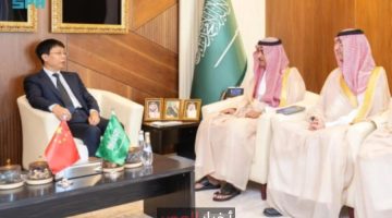وزير الإعلام يرحب برئيس صحيفة الشعب الصينية خلال احتفال افتتاح مكتبها الإقليمي في الرياض.