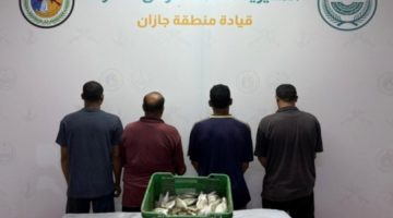 حرس الحدود بجازان يعتقل أربعة مقيمين مصريين بسبب مخالفات في قوانين الصيد.